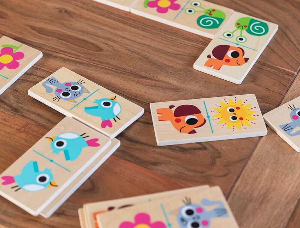 Funciona especialmente bien como primer dominó o como actividad educativa para niños que todavía están descubriendo a asociar y a emparejar las cosas.