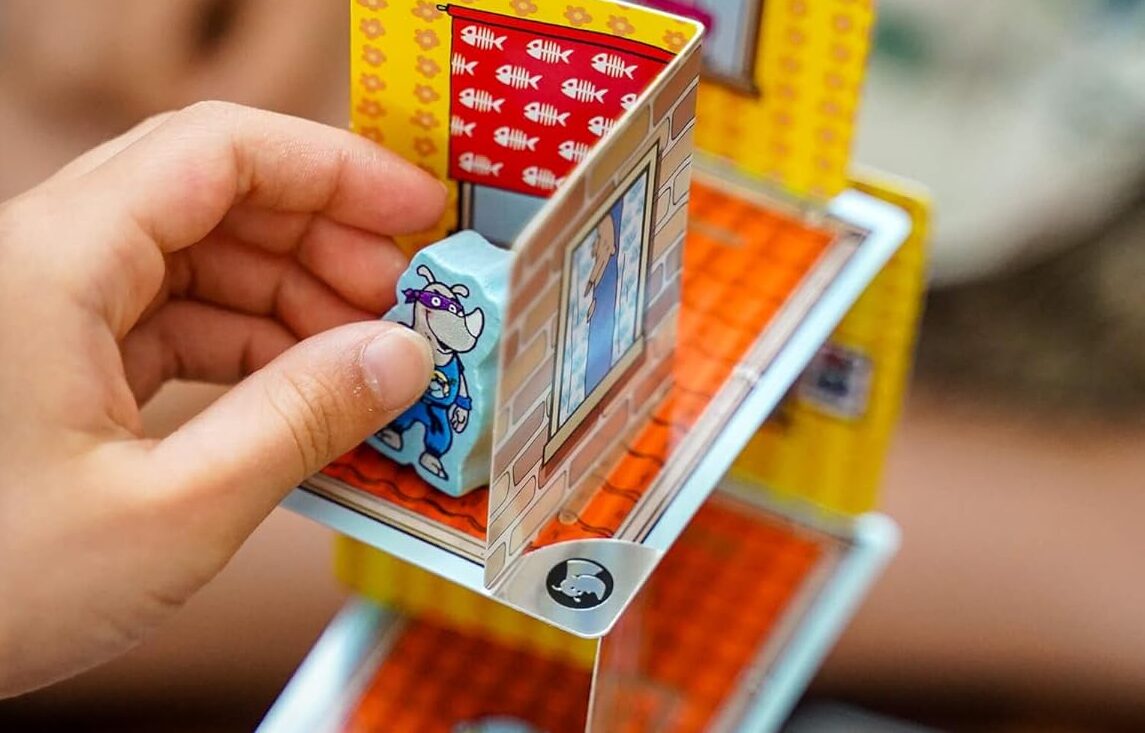 Rhino Hero es un juego de mesa para niños a partir de 5 años en el que ayudamos a un simpático rinoceronte superhéroe a escalar un rascacielos construido con cartas.